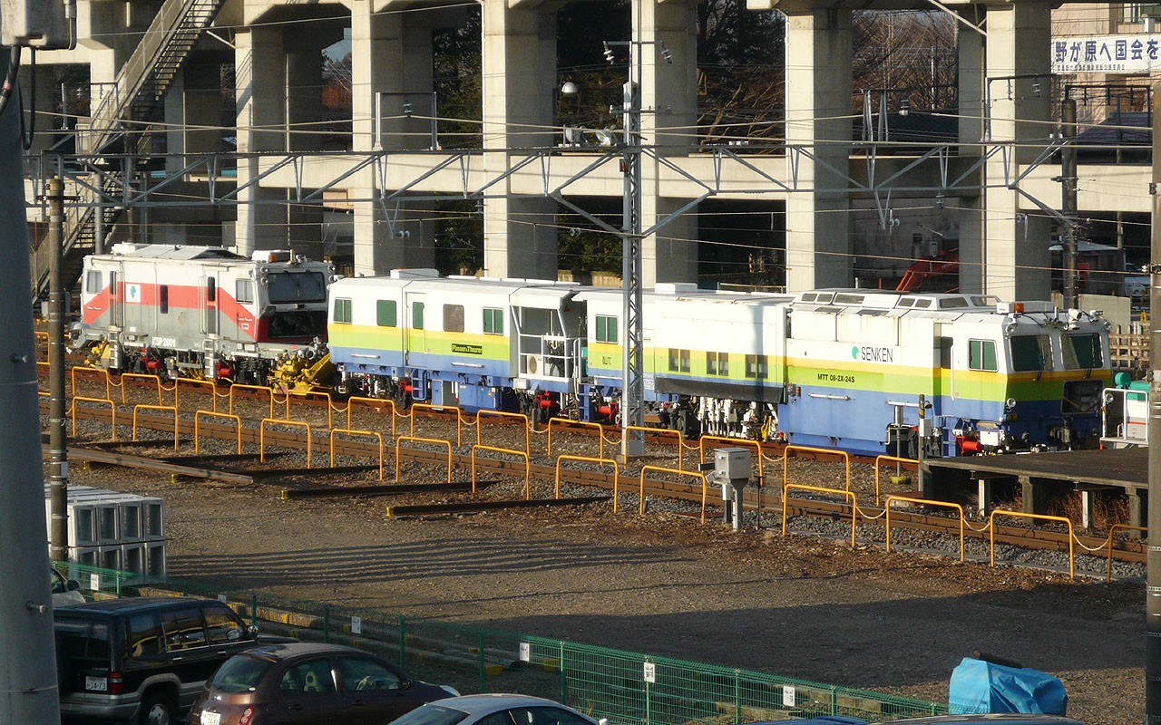 で、翌朝。右にいるのがマルタイでプラッサ&トゥエラーの MTT 08-2K-24S バラストスイーパー付き(連結されている左側の車両)。 軌道のバラストを突き固めるのがマルタイ(マルチプルタイタンパ)で、飛び散ったバラストを除去するのがバラストスイーパー。