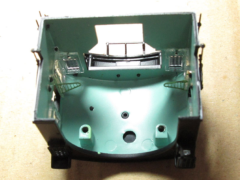 鈴木工房製の乗務員保護棒を取り付けます。うす緑に塗装してから、乗務員ドアガラスの縁にゴム系の接着剤などで接着します。取り付け代の板状の部分は切り飛ばして奥行きを調整しました。椅子の背もたれと干渉するので、取り付け位置は実車よりもやや高めになります。