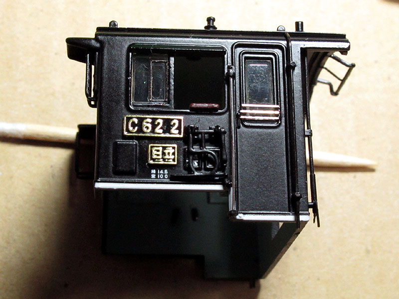 加工が終わったところ。工作の粗さが目立ってちょっと恥ずかしいです。「架線注意」札はIMONの(小)を奢りました。棒の長さは煙室の厚みよりも短くしておかないと、扉側のパーツがあたります。