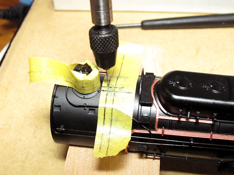 次に煙突後ろの謎の4本ボルトを付けます。1mm×2mmぐらいの長方形をマスキングテープに書き、公式側にオフセットして貼りつけます。交点をガイドに、0.4mmのドリルで4ヶ所穴をあけます。