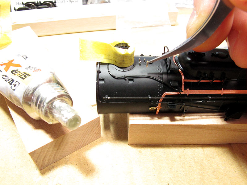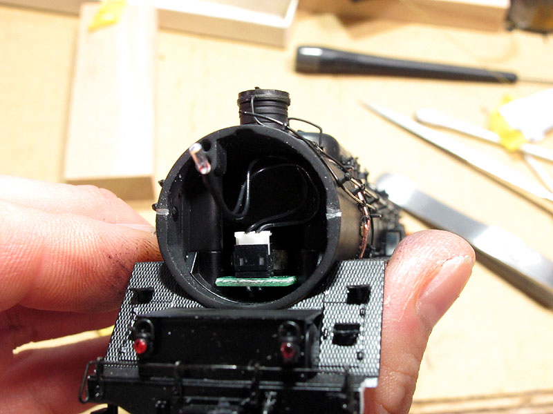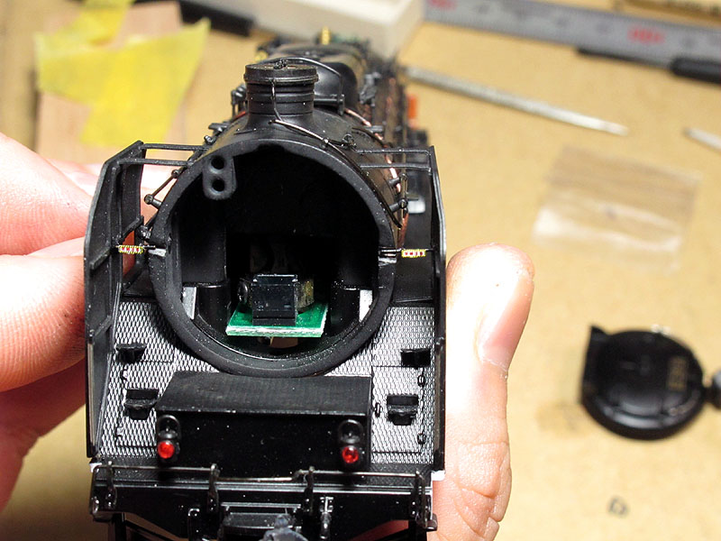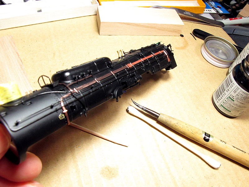 ボ イラー側にその真鍮線の逃げを掘り込みます。現物合わせで位置決めをして、カミソリノコか精密三角ヤスリなどで削っておきます。本当は実車では、もう少し 前の丸みの途中の位置に来るのですが、今後の分解を考えるとこの位置にするのが無難です。Nゲージ用のエッチング製配管受けなどを駆使して、実車同様に煙室側を 外せるようにしたいところですが、今後の課題です。写真ではくっついたままですが、電球のコネクターは抜いておいたほうが無難ですw