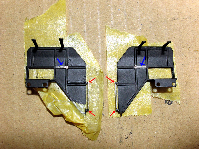 キャ ブドアにはタブレット保護棒を貼りつけます。KSモデルの0.15×0.2mmの洋白板を4.5mmぐらいに切断して、ゴム系接着剤で等間隔に貼ります。 公式側が3本非公式側が1本です。多めに切り出しておき、長さの比較的揃っている物を選って使います。非公式側の取り付け位置はHPの写真を参考にしてく ださい。