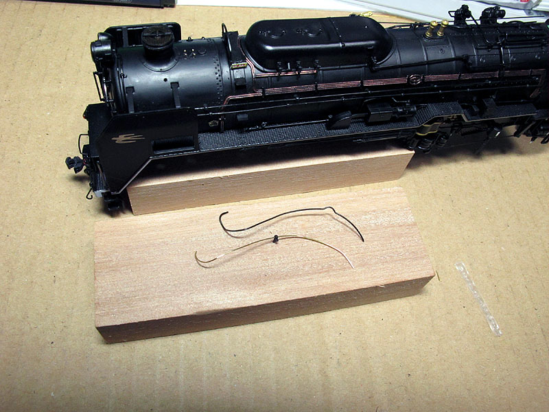 0.3mmの真鍮線を指でしごきながら、実車写真を参考に、オリジナルの形に合うように曲げていきます。難しいように見えますが、案ずるより産むが易しです。緩やかな曲線を描くように気をつけます。焼きなましてしまうと綺麗に曲がらない気がしたので下処理はしていません。最終的には真鍮線の弾力を利用してボイラーの丸みに沿うように曲げます。
