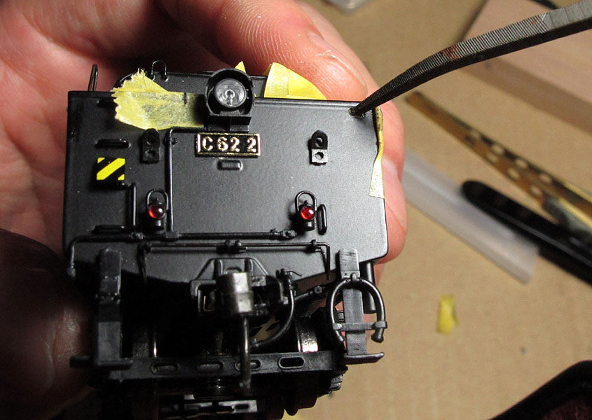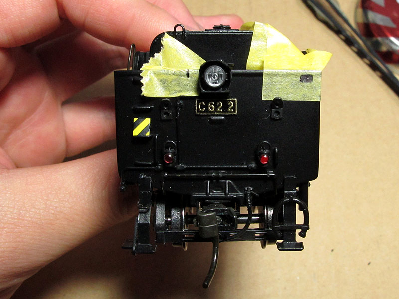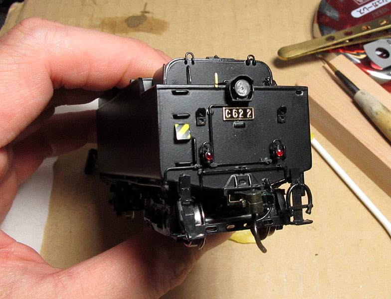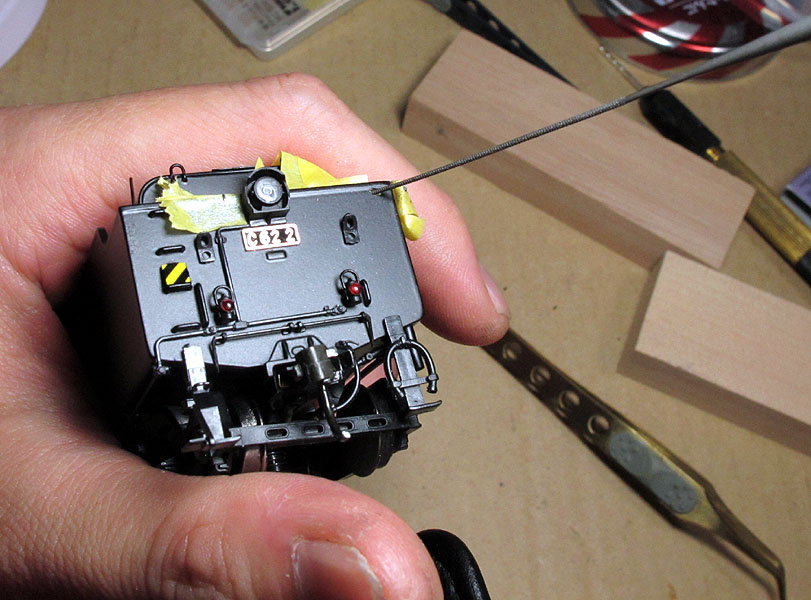 公式側の標識灯掛けはエコーのパーツです。帯板で作ってもいいのですが、はんだが出来ないので、取り付け用の棒がモールドされている、エコーのパーツを使いました。穴は0.4mmで開けています。