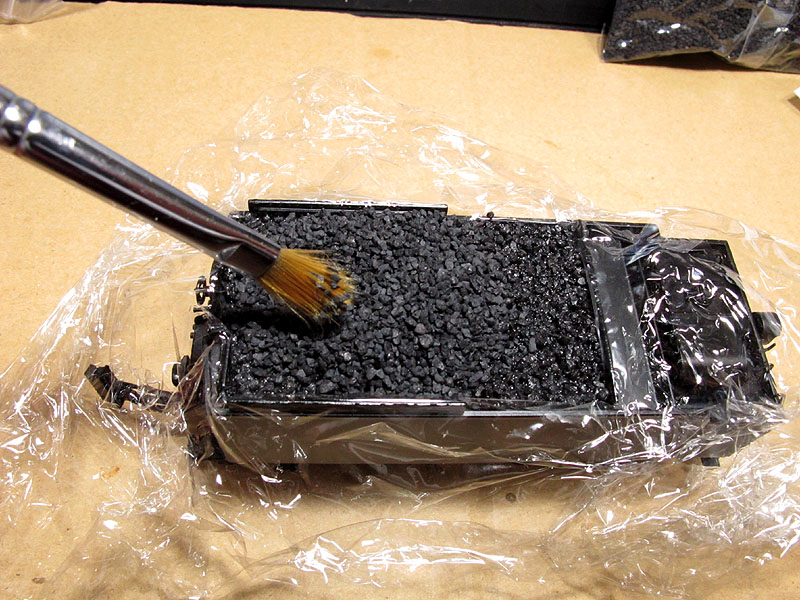 薄めた木工ボンドが染みこんでいかないように、サランラップで防水していますが、あまり良い方法ではないです。縁の部分の石炭が、ラップに結構くっついてしまうんですよね。後処理が結構大変です。