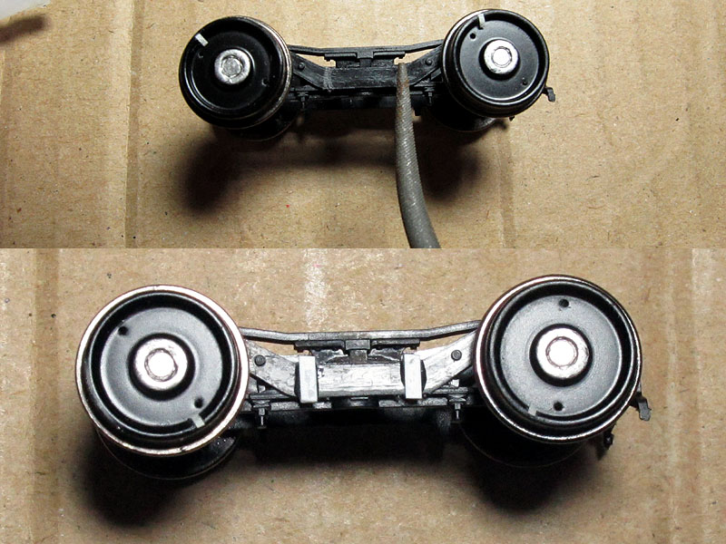ブラス初代からの異常にタイヤ部分がすり減った、形状のおかしな先輪も交換したいところですが、先台車ごと交換する必要がありそうなので今回はパスです。いったいいくつ作ったのか知りませんが、いい加減形状を見なおして欲しいですね。タイヤマークは塗りではなくて、レトラのテープだってことがバレちゃいましたw