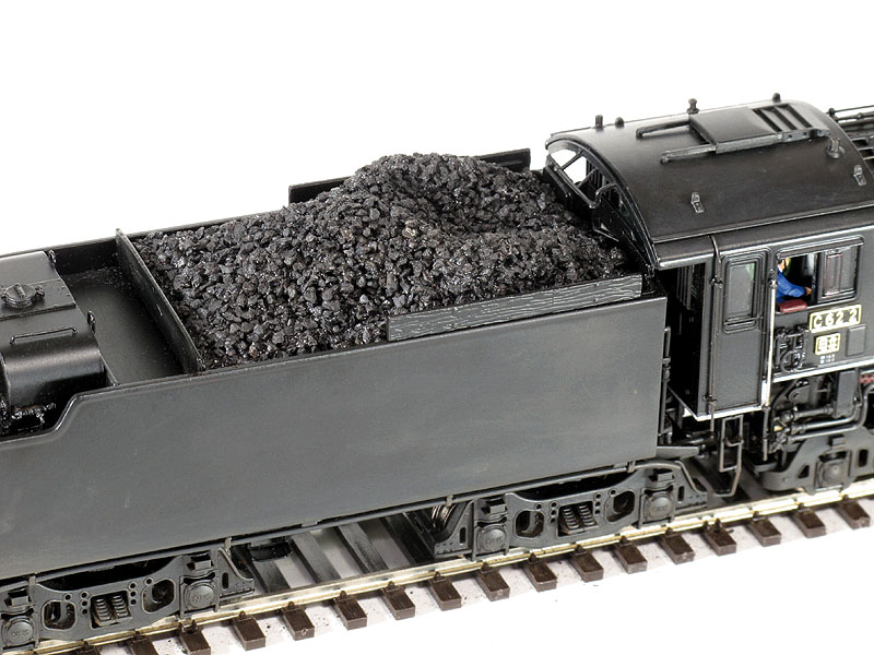 キャブにはKATOの機関士を載せています。最近発売された方のではなくて、以前からある(プライザー製?)のものです。キャブ内部はバックプレートがモーターのおかげでかなり後退しているので、機関士は右足切断(ぎゃー)。機関助士は左足切断(うぐぅ~)です。空気作用管はスミ入れ+軽いウェザリングでかなり良くなりますね。自作するか、エコーの組み立て済みパーツと交換するかは微妙なところです。30cmも離れたら一体構造のエッチングかどうかなんてほとんどわかりませんから。