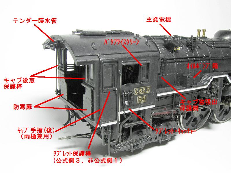 主発電機は、この模型では長さが長いタイプですが、71年ごろの写真を見ると短いタイプ(後部のカバーがない)ものがついています。梅小路の2号機はマフラーが立っていますが、北海道時代はずっと模型の様に斜めに寝ています。