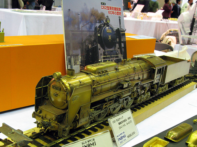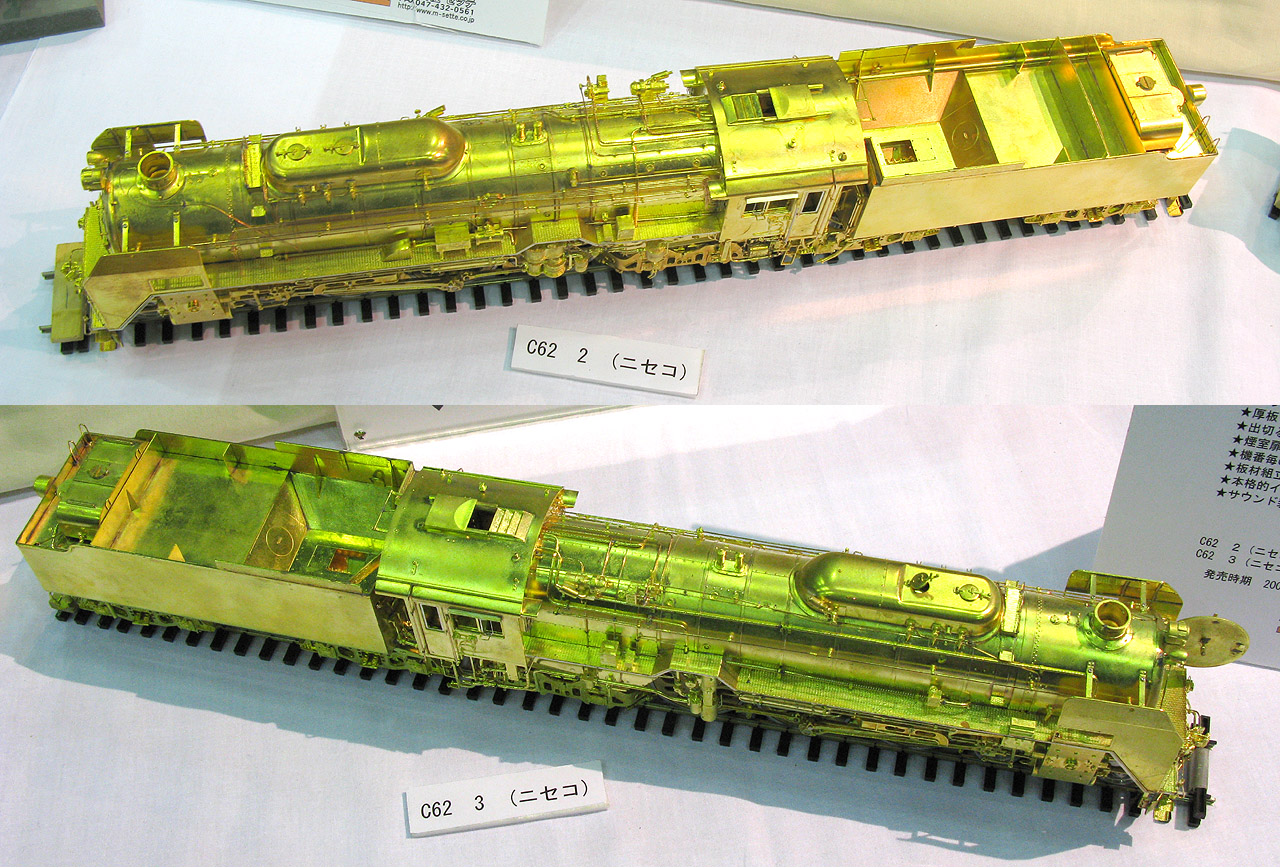 写真のは製作途中で、まだ付いていない部品がいくつもあるそうです(ま、みればわかるか)。通過半径は2000Rとのことです(出荷検査は1800R)。 記憶にある限りの2号機と3号機の違いは、すべて再現されていました。動輪は3層構造でドロップ(エッチング+プレス抜きのことじゃないかなぁ?)とロス トの組み合わせになるそうです。このサイズになると、ロストはゆず肌や歪みが目立つそうで、極力廃したとのこと。リベットは打ち出しだそうです。そりゃ、 セミマスプロ生産で植え込みはなぁ……。ちょっと気になったのが、2号機の増炭板の長さ。エンジン側に若干長いので、飾るときに機炭間を実車どおりに縮めるのは無理そうです。煙室扉のナンバープレートの取り付け方もちょっと気になります(どうなるのか聞き忘れた!)。