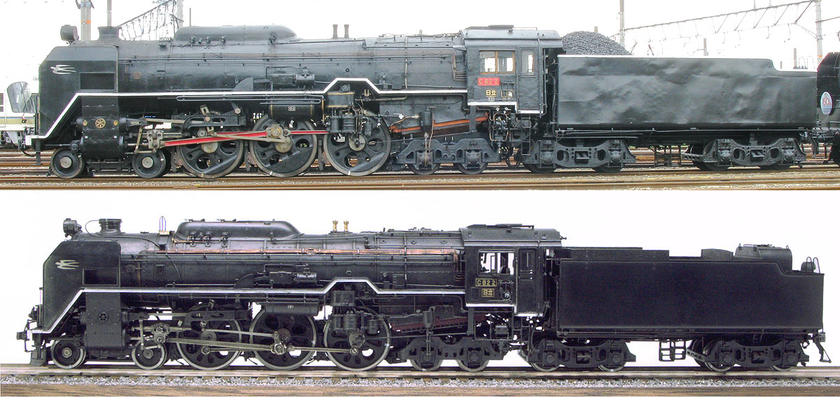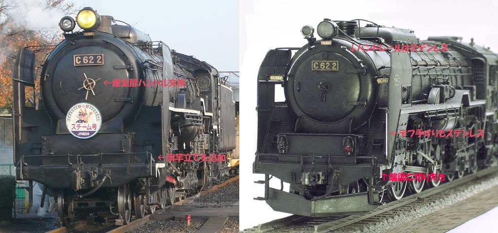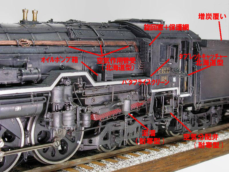 2号機の空気作用管は中間の広がったところから、1つおいてキャブ側の3箇所だけが、間隔の広がった北海道型になっています。3号機は全部がそう。2号機も今は3号機同様に、途中で広がった部分の無いストレートな配管で作用管受けもすべて間隔の開いたものになっています。煙室付近の立下りも、ボイラー銘板の前側に移動しています。キャブに目を戻すと、キャブ手すりも前方の部分だけが、ステンレス製で、銀色に光っています。元は前後とも宮原時代にステンレス製になっていたのですが、雨といと兼用に改造されたため、後方は黒色に塗装されています。現在ではメンテナンスのたびに両方とも黒色に塗られたり、両方とも白で塗装されたりを繰り返しているようです。