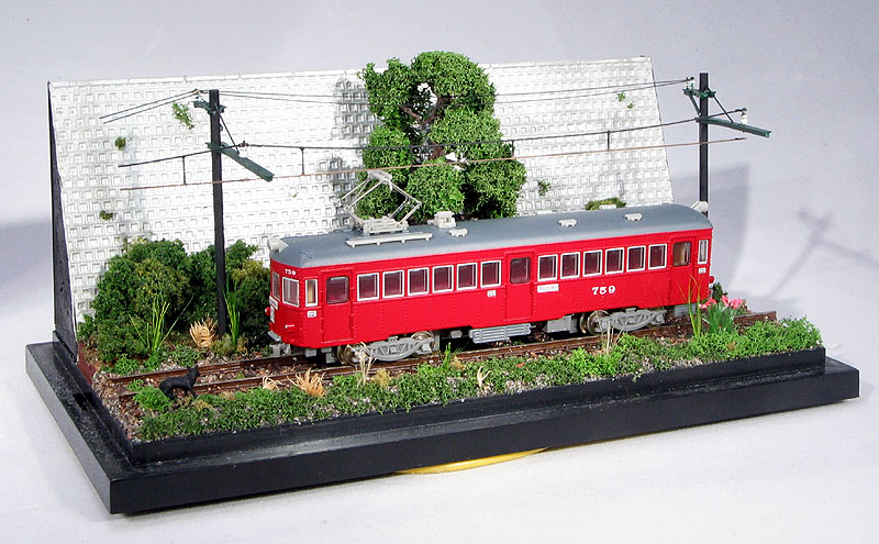 写真はその中の一つ。Nゲージ用ですが、WAVEのプラケース(Tケース・S)にちょうど地方私鉄の単行車両が飾れるぐらいのものを作ってみました。他にもいくつかあったのですが、みんな知り合いやら友人やらに取られたりあげてしまったり……。